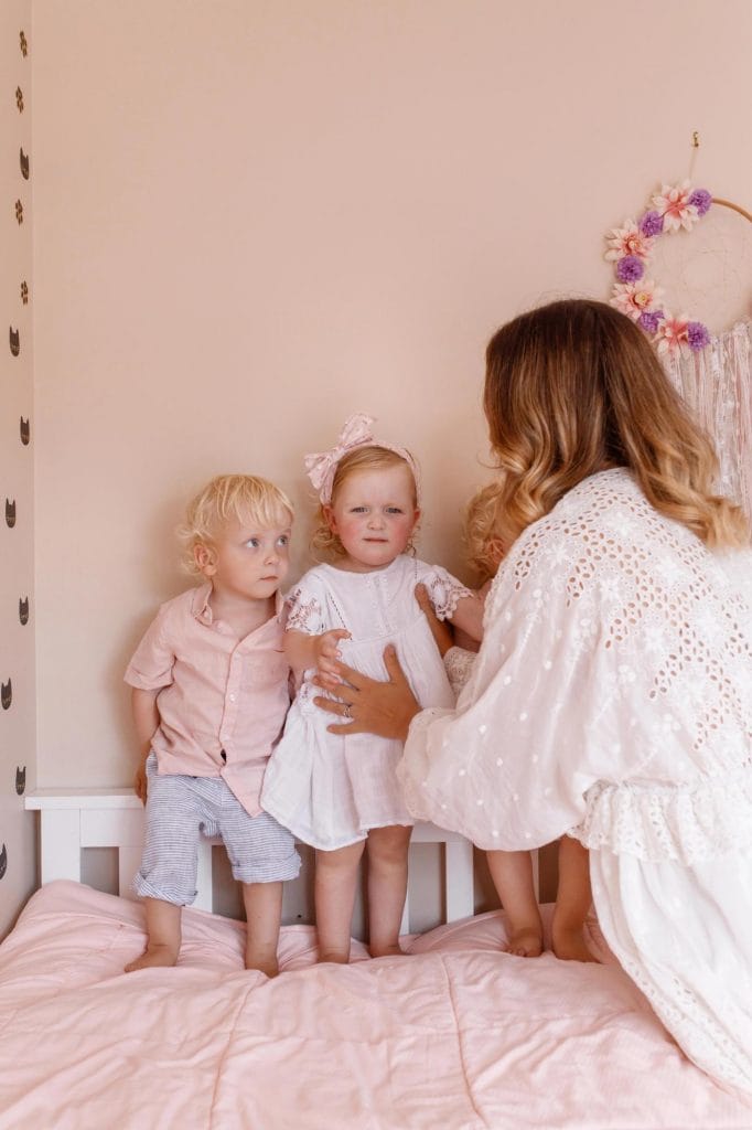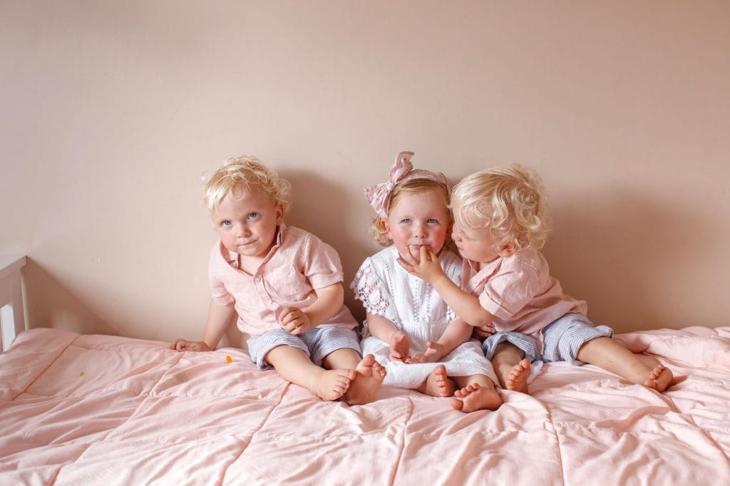 “They were definitely easier then because even though you’re on a three-hour routine with babies, at least we could put them down and know where they were. Now we’re continuously thinking, ‘Where are they? What are they doing? What are they getting into?’” she laughs. “They’ll probably stay in cots for a while, even if it’s until they’re five, just to keep them in their bed!”